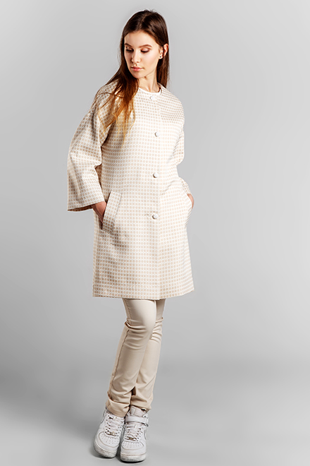Элегантное летнее пальто с цветочным узором, образующим клетку, со спущенными рукавами 3/4 и округлым вырезом горловины. Спереди скрытая застежка на пришивные кнопки, по бокам - прорезные карманы. Длина рукава - 63см. Длина по спинке - 93см. Рост модели 175см.