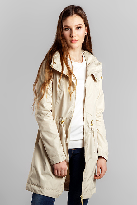 Яркая эффектная молодежная парка с кулисой по линии талии и низа - идеальный вариат для теплой весеннй погоды и непогоды. Глубокая линия горловины очень удобна, воротник со скрытым, под молнию, капюшоном и накладной патой на кнопках. Центральная застежка и застежка обманка - на молнию, золотая фурнитура, удобные карманы в рельефах, ластовицы с люверсами. Длина по спинке - 87см., длина рукава - 65см., рост модели 175см.